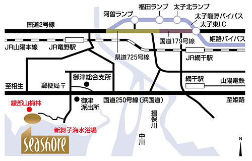 JR姫路駅、JR相生駅より車で約30分